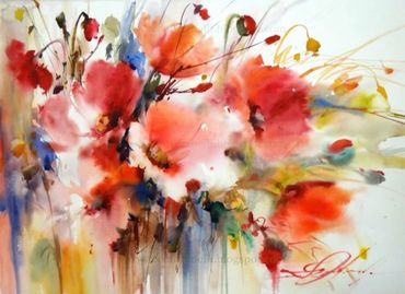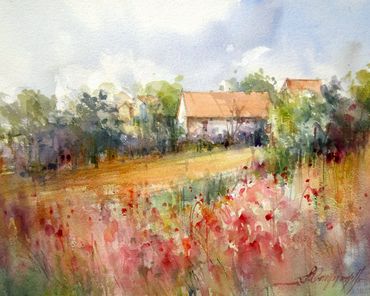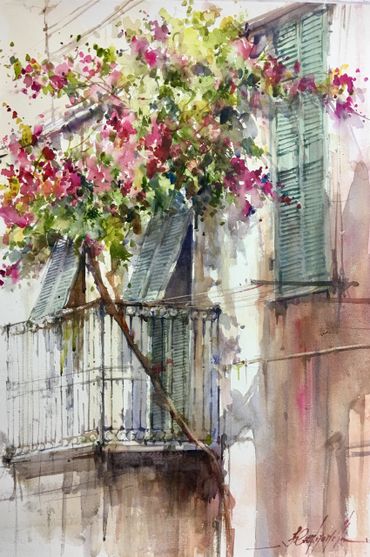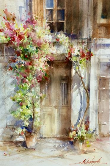 "What compels me to paint with this approach is the possibility of painting quickly. It suits my personality best -- the fluidity of the medium provides a unique sensation of unexpected colour mixing, particularly when I define only the main masses and allow the unpredictable to happen on the rest of the paper. Timing is quite important in my method. I lean intuitively toward realism, but the right speed forces me to create diffused effects and shapes. I love painting flowers and landscapes in watercolour and I'm always enchanted by the attempt to capture the contrast between loose and definitive edges, as well as light and shadow effects."